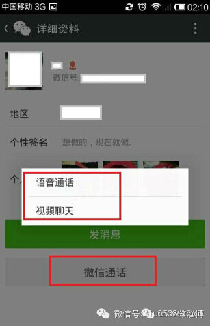 朋友详细页面,视频聊天按钮描述变为微信通话,并且可以选择语音和视频。算是对QQ功能的复制,通化多元化,弥补了微信语音60秒通话的缺陷。