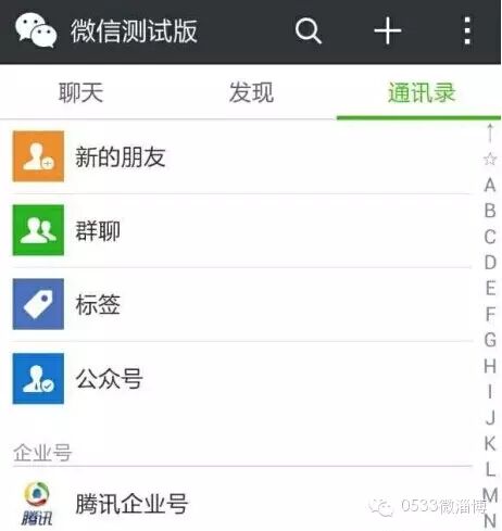特性2:通讯录栏目增加了“标签”功能,同时将订阅号和服务号的标签统一为“公众号”;