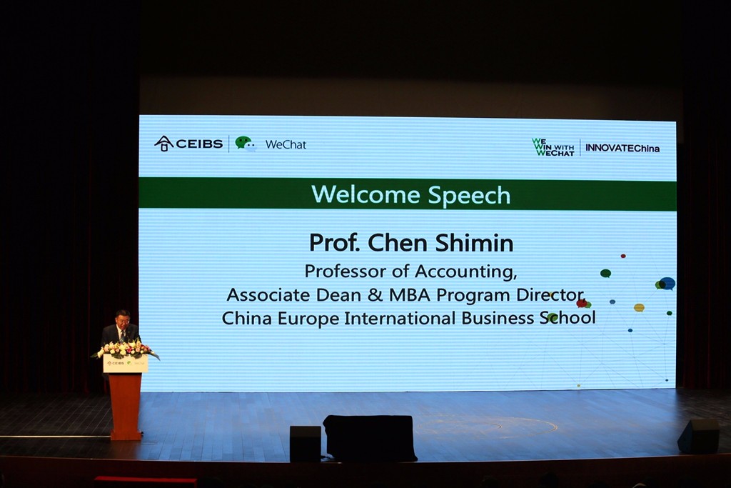 中 欧国际工商学院副教务长、MBA课程主任陈世敏教授发表开幕致辞。他表示:中国经济发展和制度变迁创造了前所未有的挑战和机遇。移动互联网的发展,创造出 新的商业模拟和生活方式,在全球范围内带来了破坏式、颠覆式的变化。因为创新这一共同特点,微信和中欧国际工商学院走在一起,强强连手,创造了一个具有创 造力的、创新的平台。本届“微信全球MBA创新大赛——创意中国 2015”(We Win with WeChat——INNOVATEChina 2015)让世界各地商学院的创新头脑汇聚一堂,将为商界和社会带来深远影响。
