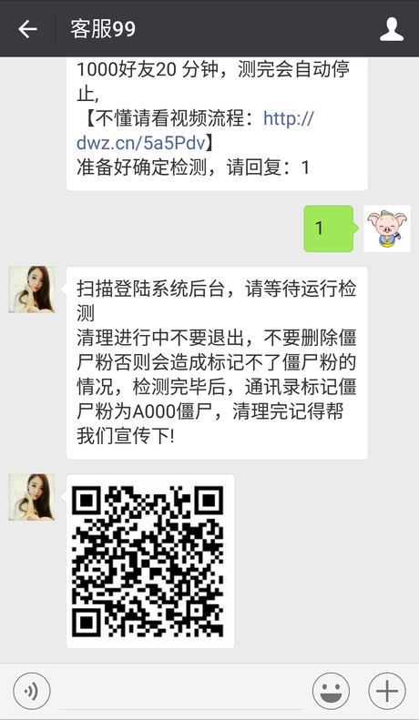 待你确认清理后,客服会发送一个临时二维码。此二维码不能直接识别,需要将它发送至其他手机或用其他手机拍照,再进行识别。