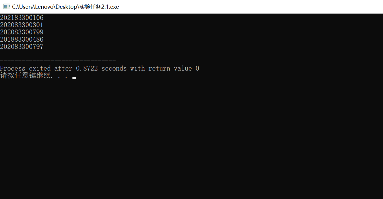 #include<stdio.h> #include<stdlib.h> #include<time.h> #define N 5 int main() { int grade,number; int i; srand(time(0)); for(i=0;i<N;++i) { grade=rand()%4+2018;//随机生成2018~2021的整数赋值给grade number=rand()%999+1;//随机生成1~999的整数赋值给number printf("%d8330%04d\n",grade,number); } return 0; } //这个程序随机生成xxxx83300xxx格式的学号