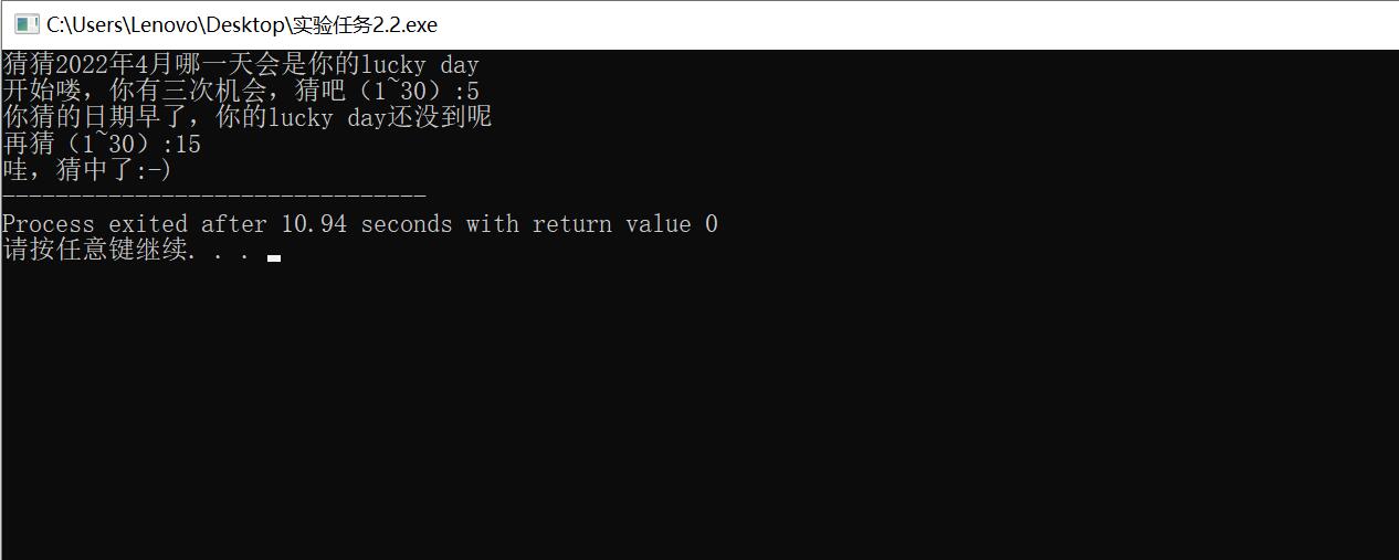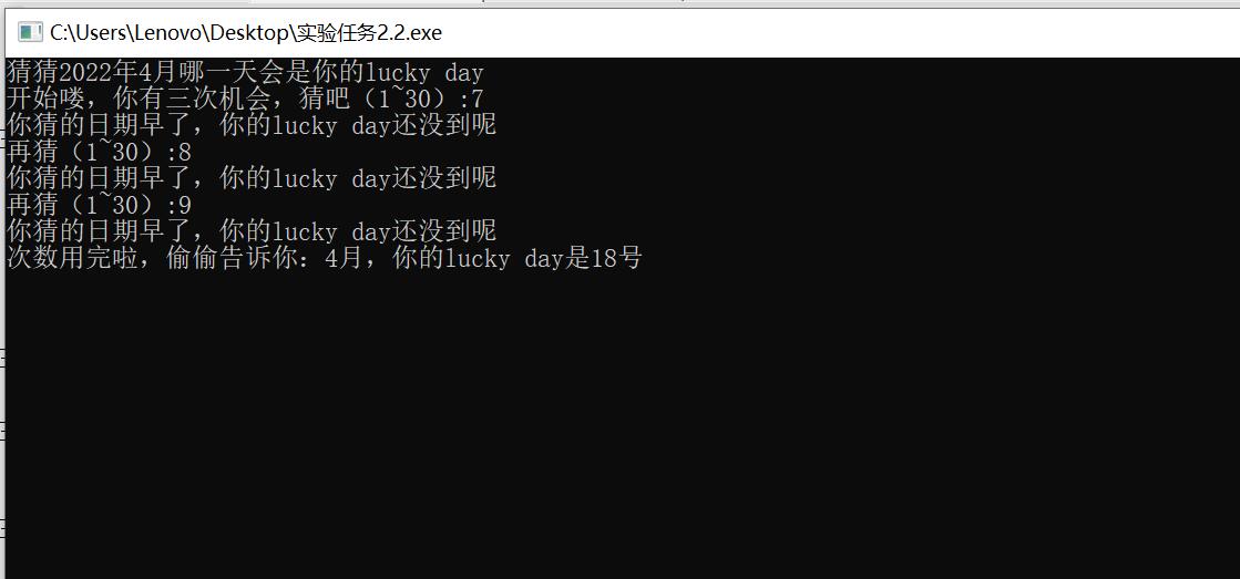 #include<stdio.h> #include<stdlib.h> #include<time.h> int main() { int x,y,n; srand(time(0)); y=rand()%30+1; printf("猜猜2022年4月哪一天会是你的lucky day\n"); printf("开始喽,你有三次机会,猜吧(1~30):"); for(n=1;n<3;n++) { scanf("%d",&x); if(x<y) { printf("你猜的日期早了,你的lucky day还没到呢\n"); } else if(x>y) { printf("你猜的日期晚了,你的lucky day已经过啦\n"); } else { printf("哇,猜中了:-)"); exit(0); } if(n!=3) printf("再猜(1~30):"); else if(n==3) printf("次数用完啦,偷偷告诉你:4月,你的lucky day是%d号\n",y); } return 0; }