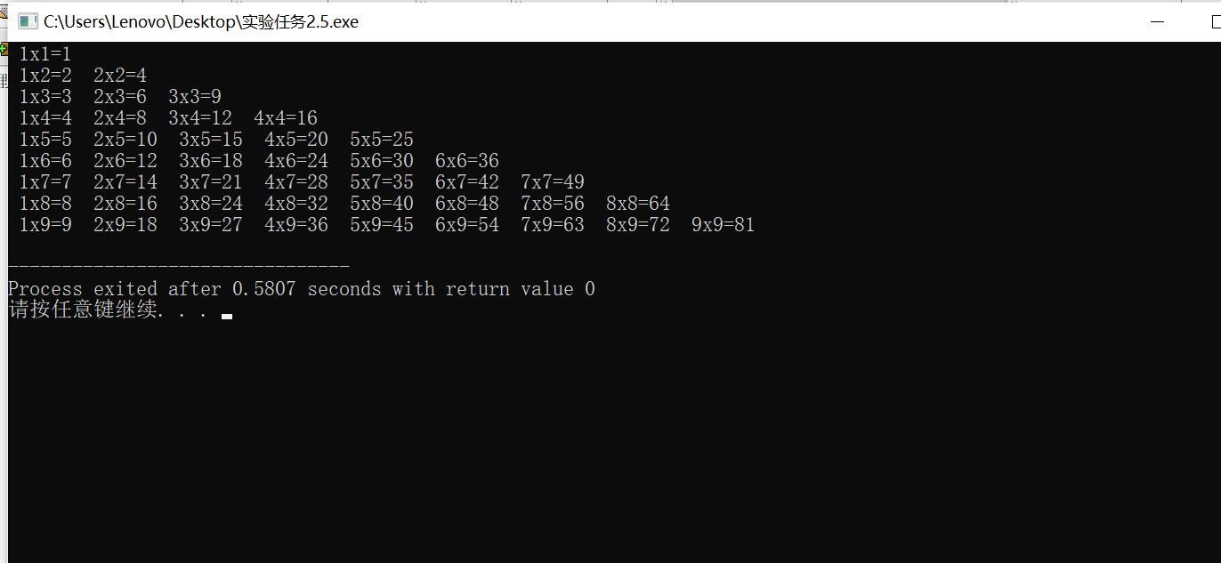 #include<stdio.h> #define N 9 int main() { int i,m,n; int line=1; for(i=1;i<=N;i++) { for(m=1;m<=line;m++) { n=i*m; printf(" %dx%d=%d ",m,i,n); } printf("\n"); line++; } return 0; }