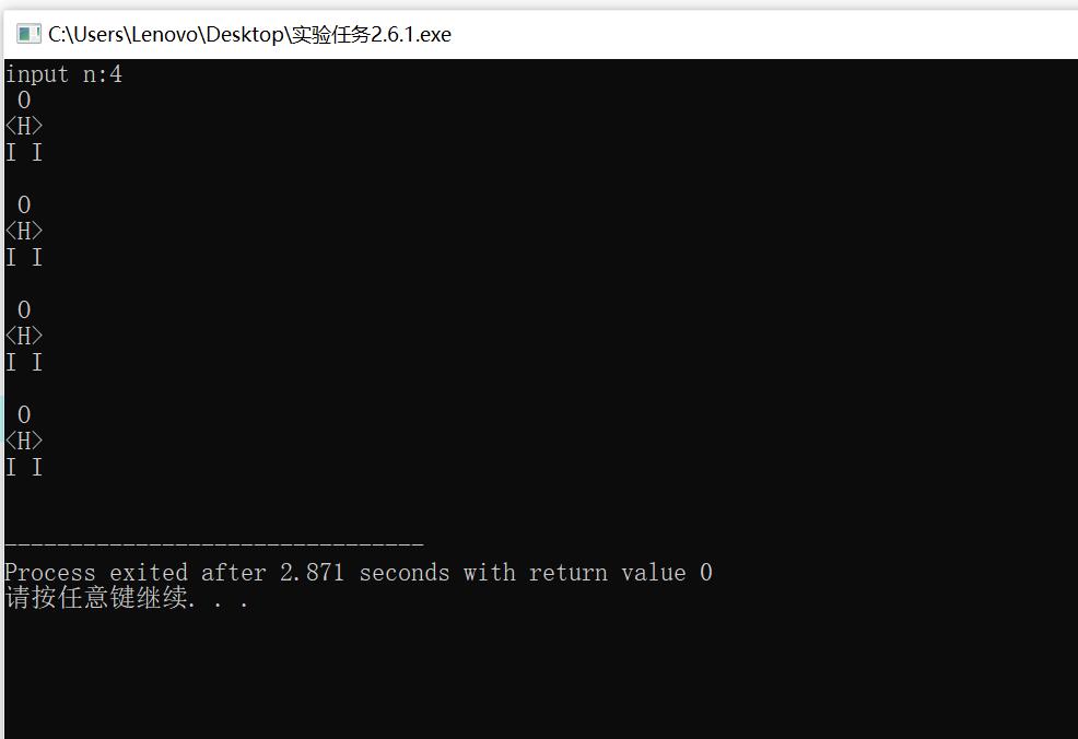 #include<stdio.h> int main() { int n,i=1; printf("input n:"); scanf("%d",&n); while(i<=n) { printf(" O\n"); printf("<H>\n"); printf("I I\n"); printf("\n"); i++; } return 0; }