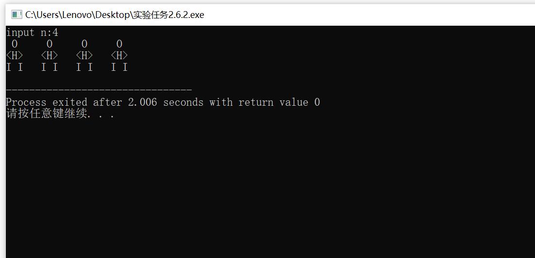 #include<stdio.h> int main() { int n,i=1; printf("input n:"); scanf("%d",&n); while(i<=n) { printf(" O "); printf(" "); i++; } printf("\n"); i=1; while(i<=n) { printf("<H>"); printf(" "); i++; } printf("\n"); i=1; while(i<=n) { printf("I I"); printf(" "); i++; } printf("\n"); return 0; }
