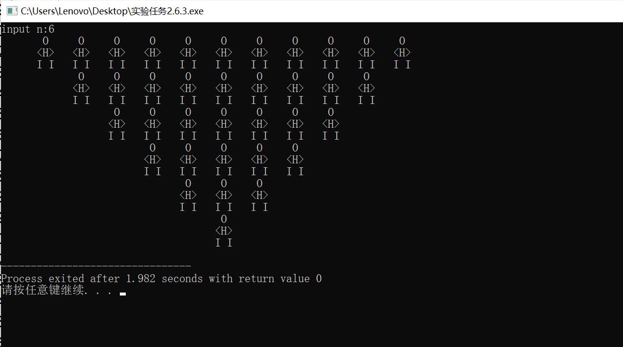 #include<stdio.h> int main() { int n,m,i=1; printf("input n:"); scanf("%d",&n); while(n>0) { for(m=0;m<i;m++) { printf(" "); } for(m=1;m<=2*n-1;m++) { printf(" O "); printf(" "); } printf("\n"); for(m=0;m<i;m++) { printf(" "); } for(m=1;m<=2*n-1;m++) { printf("<H>"); printf(" "); } printf("\n"); for(m=0;m<i;m++) { printf(" "); } for(m=1;m<=2*n-1;m++) { printf("I I"); printf(" "); } printf("\n"); n--; i++; } return 0; }