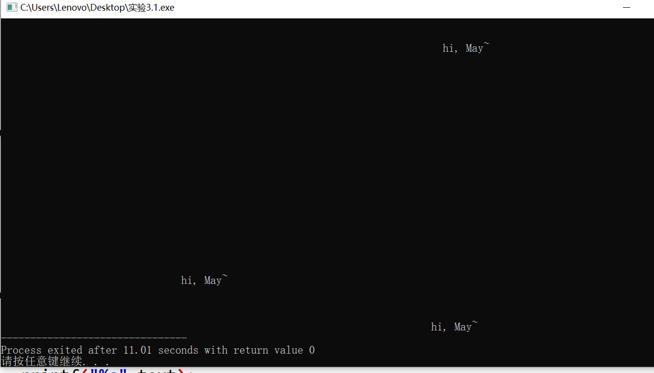 #include<stdio.h> #include<stdlib.h> #include<time.h> #include<windows.h> #define N 80 void printText(int line,int col,char text[]); void printSpaces(int n); void printBlankLines(int n); int main() { int line,col,i; char text[N]="hi, May~"; srand(time(0)); for(i=1;i<=10;++i) { line=rand()%25; col=rand()%80; printText(line,col,text); Sleep(1000); } return 0; } void printSpaces(int n) { int i; for(i=1;i<=n;++i) printf(" "); } void printBlankLines(int n) { int i; for(i=1;i<=n;++i) printf("\n"); } void printText(int line,int col,char text[]) { printBlankLines(line-1); printSpaces(col-1); printf("%s",text); }