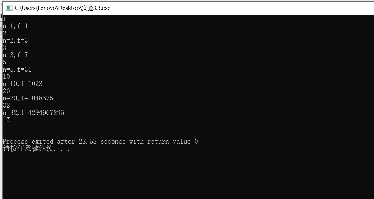 #include<stdio.h> long long fun(int n); int main() { int n; long long f; while(scanf("%d",&n)!=EOF) { f=fun(n); printf("n=%d,f=%lld\n",n,f); } return 0; } long long fun(int n) { int i; long long f,j=1.0; for(i=1;i<=n;i++) { j=j*2; } f=j-1; return f; }