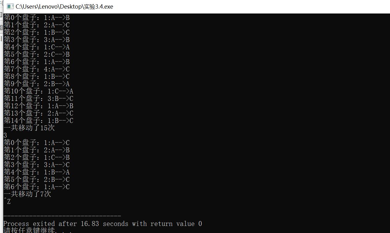 #include<stdio.h> void hanoi(unsigned int n,char from,char temp,char to); void moveplate(unsigned int n,char from,char to); int i; int main() { unsigned n; while(scanf("%u",&n)!=EOF) { i=0; hanoi(n,'A','B','C'); printf("一共移动了%d次",i); } return 0; } void hanoi(unsigned int n,char from,char temp,char to) { if(n==1) moveplate(n,from,to); else { hanoi(n-1,from,to,temp); moveplate(n,from,to); hanoi(n-1,temp,from,to); } } void moveplate(unsigned int n,char from,char to) { printf("第%d个盘子:%u:%c-->%c\n",i,n,from,to); i++; }