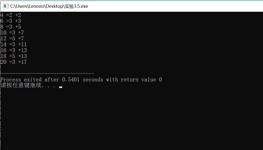 #include<stdio.h> #include<stdlib.h> #include<math.h> int is_prime(int n); int main() { int n,p,q,flagp,flagq; for(n=4;n<=20;n+=2) { p = 1; do { p++; q=n-p; flagp=is_prime(p); flagq=is_prime(q); } while(flagq*flagp == 0); printf("%d =%d +%d\n", n, p, q); } return 0; } int is_prime(int n) { int i; for(i=2;i<n;i++) if(n%i==0) break; if(i<n) return 0; else return 1; }