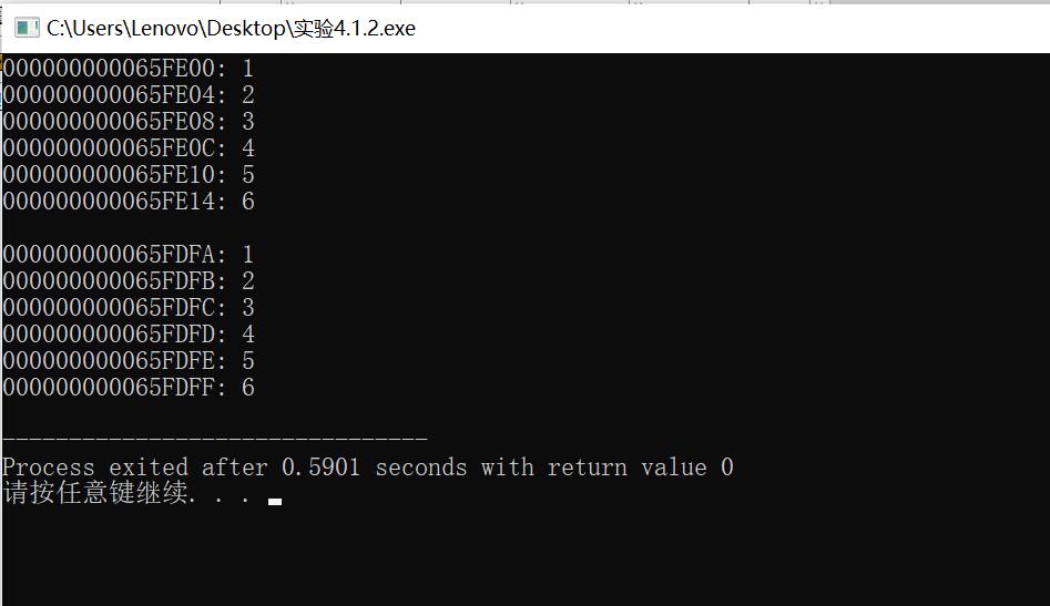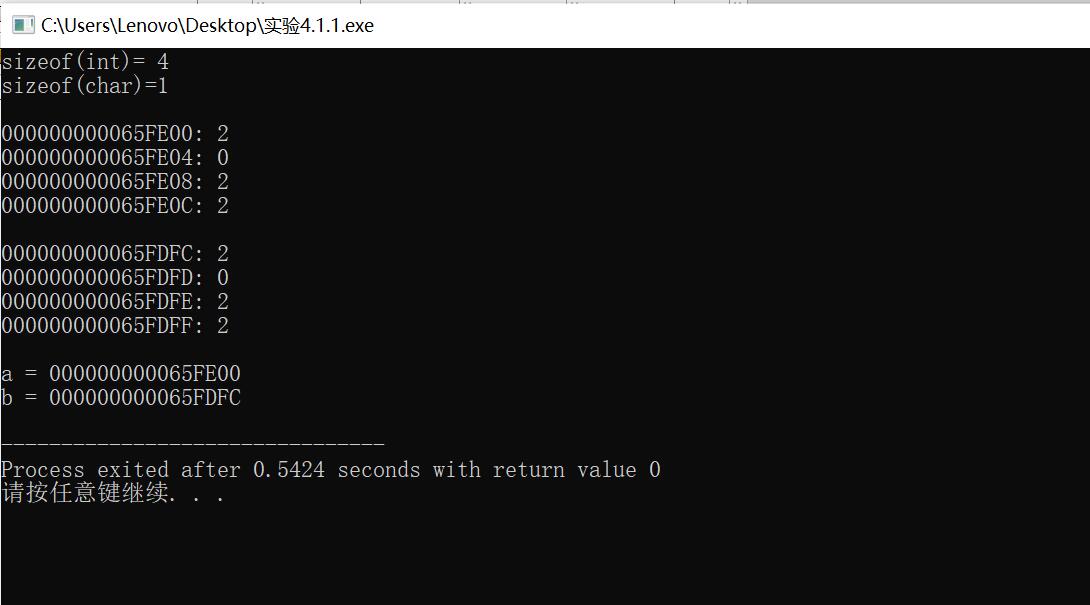 #include<stdio.h> #define N 4 int main() { int a[N]={2,0,2,2}; char b[N]={'2','0','2','2'}; int i; printf("sizeof(int)= %d\n",sizeof(int)); printf("sizeof(char)=%d\n",sizeof(char)); printf("\n"); for(i=0;i<N;++i) printf("%p: %d\n",&a[i],a[i]); printf("\n"); for(i=0;i<N;++i) printf("%p: %c\n",&b[i],b[i]); printf("\n"); printf("a = %p\n",a); printf("b = %p\n",b); return 0; }