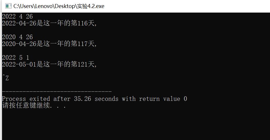 #include<stdio.h> int days_of_year(int year,int month,int day); int main() { int year,month,day; int days; while(scanf("%d%d%d",&year,&month,&day)!=EOF) { days=days_of_year(year,month,day); printf("%4d-%02d-%02d是这一年的第%d天,\n\n",year,month,day,days); } return 0; } int days_of_year(int year,int month,int day) { int days[12]={31,28,31,30,31,30,31,31,30,31,30,31}; int s=0,i; for(i=0;i<month-1;++i) s=s+days[i]; s=s+day; if(year%4==0||year%100==0&&year%400!=0) s=s+1; return s; }