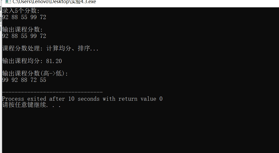 #include <stdio.h> #define N 5 // 函数声明 void input(int x[], int n); void output(int x[], int n); double average(int x[], int n); void sort(int x[], int n); int main() { int scores[N]; double ave; printf("录入%d个分数:\n", N); input(scores, N); printf("\n输出课程分数: \n"); output(scores, N); printf("\n课程分数处理: 计算均分、排序...\n"); ave = average(scores, N); sort(scores, N); printf("\n输出课程均分: %.2f\n", ave); printf("\n输出课程分数(高->低):\n"); output(scores, N); return 0; } // 函数定义 // 输入n个整数保存到整型数组x中 void input(int x[], int n) { int i; for(i=0; i<n; ++i) scanf("%d", &x[i]); } // 输出整型数组x中n个元素 void output(int x[], int n) { int i; for(i=0; i<n; ++i) printf("%d ", x[i]); printf("\n"); } double average(int x[], int n) { int i; double s=0; for(i=0;i<n;i++) s+=x[i]; return s/n; } void sort(int x[],int n) { int i,j,t; for(i=0;i<n-1;i++) { for(j=0;j<n-1-i;j++) { if(x[j]<x[j+1]) { t =x[j]; x[j]=x[j+1]; x[j+1]=t; } } } }