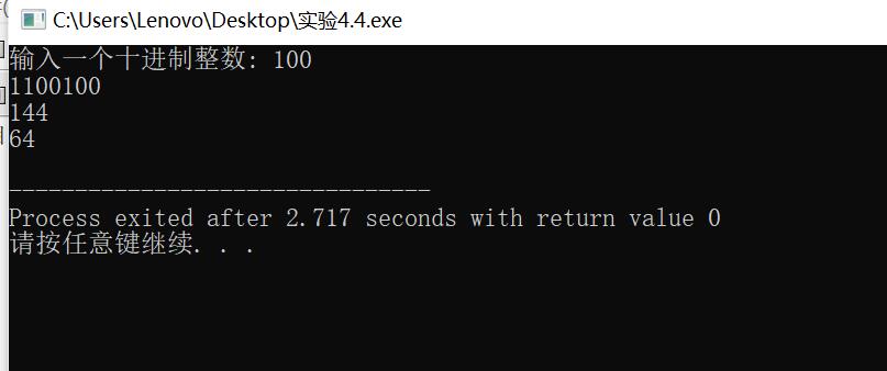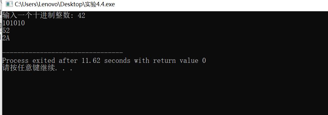 #include <stdio.h> void dec2n(int x, int n); // 函数声明 int main() { int x; printf("输入一个十进制整数: "); scanf("%d", &x); dec2n(x, 2); // 函数调用: 把x转换成二进制输出 dec2n(x, 8); // 函数调用: 把x转换成八进制输出 dec2n(x, 16); // 函数调用: 把x转换成十六进制输出 return 0; } void dec2n(int x,int n) { int a[100]; int i,k,j=0; while(x!=0) { i=x%n; a[j++]=i; x=x/n; } for(k=j-1;k>=0;k--) { if(a[k]>9&&a[k]<16) printf("%c",a[k]-10+'A'); else printf("%d",a[k]); } printf("\n"); }