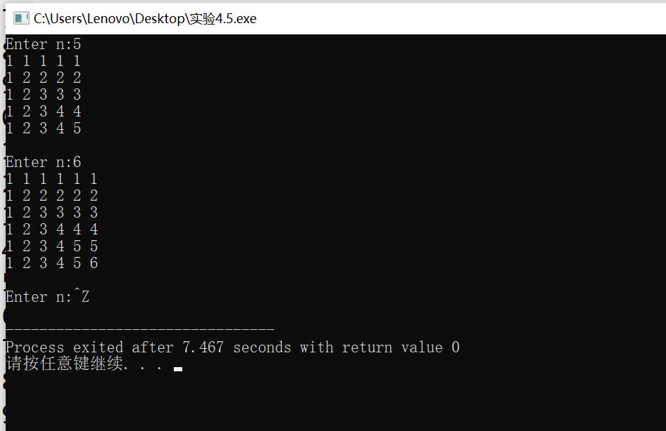 #include <stdio.h> int main (void) { int n,i,j; while( printf("Enter n:"),scanf("%d",&n)!=EOF) { int a[n][n]; for (i=0;i<n;i++) { for (j=i;j<n;j++) { a[i][j]=i+1; } } for (j=0;j<n;j++) { for (i=j;i<n;i++) { a[i][j]=j+1; } } for (i=0;i<n;i++) { for (j=0;j<n;j++) { printf("%d ",a[i][j]); } printf("\n"); } printf("\n"); } return 0; }
