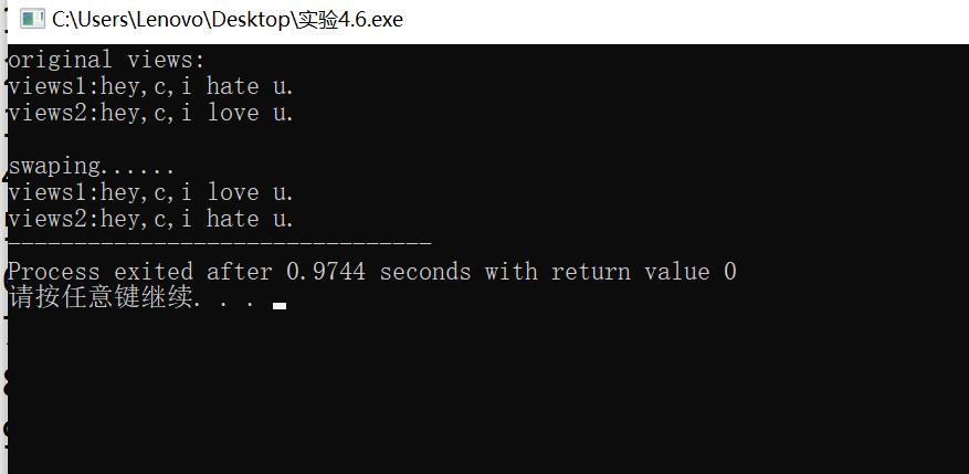 #include<stdio.h> #define N 80 int main() { int i; char views1[N]="hey,c,i hate u."; char views2[N]="hey,c,i love u."; printf("original views:\n"); printf("views1:"); puts(views1); printf("views2:"); puts(views2); printf("\n"); char t; for(i=0;views1[i]!='\0';i++) { t=views1[i]; views1[i]=views2[i]; views2[i]=t; } printf("swaping......"); printf("\n"); printf("views1:"); puts(views1); printf("views2:"); printf(views2); return 0; }