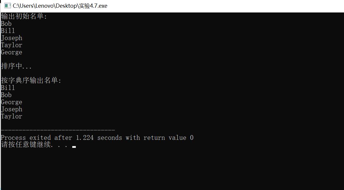 #include <stdio.h> #include <string.h> #define N 5 #define M 20 void bubble_sort(char str[][M], int n); int main() { char name[][M] = {"Bob", "Bill", "Joseph", "Taylor", "George"}; int i; printf("输出初始名单:\n"); for (i = 0; i < N; i++) printf("%s\n", name[i]); printf("\n排序中...\n"); bubble_sort(name, N); printf("\n按字典序输出名单:\n"); for (i = 0; i < N; i++) printf("%s\n", name[i]); return 0; } void bubble_sort(char str[][M],int n) { int i, j; char a[M]; for(i=0;i<N;i++) { for(j=0;j<N-1;j++) { if (strcmp(str[j], str[j+1]) > 0) { strcpy(a, str[j]); strcpy(str[j], str[j+1]); strcpy(str[j+1], a); } } } }