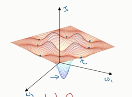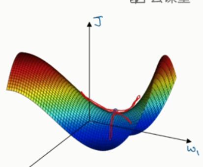 在高纬度的代价函数优化问题中,迭代过程中并不会落入局部最优解,而是会得到一个鞍点,右边的图是代价函数图像,所以这个鞍点是梯度为0,但是却不是局部最小值。