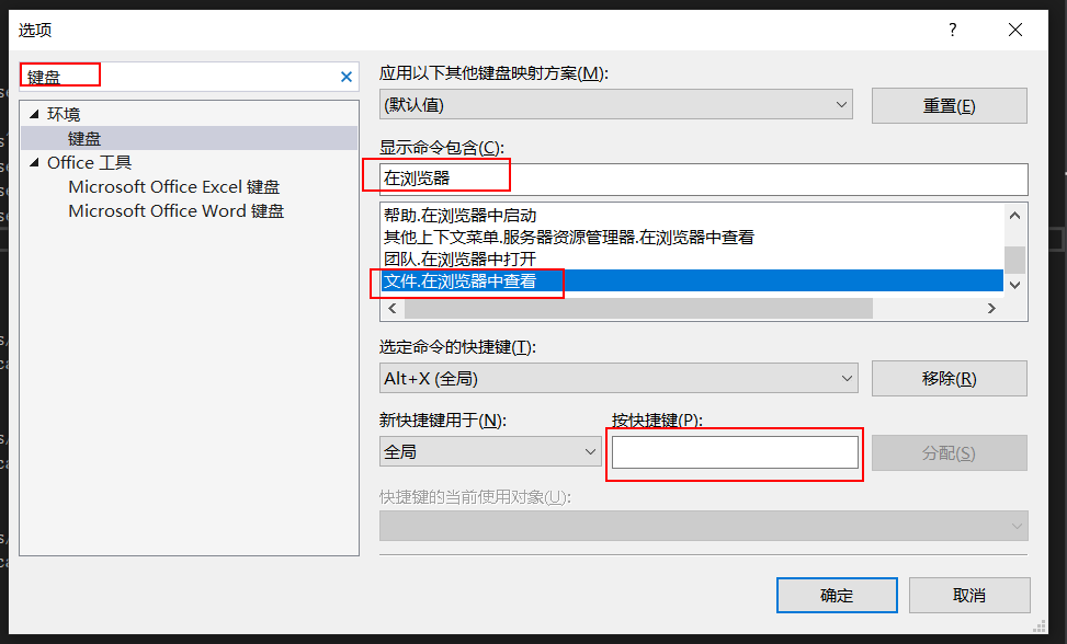 然后在“显示命令包含”中搜索‘在浏览器查看",选择文件.在浏览器中查看,然后自定义同时按下alt+x快捷键即可。