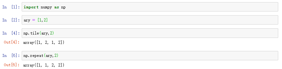 | np.tile([1,2],2) | 数组元素的连续重复 |