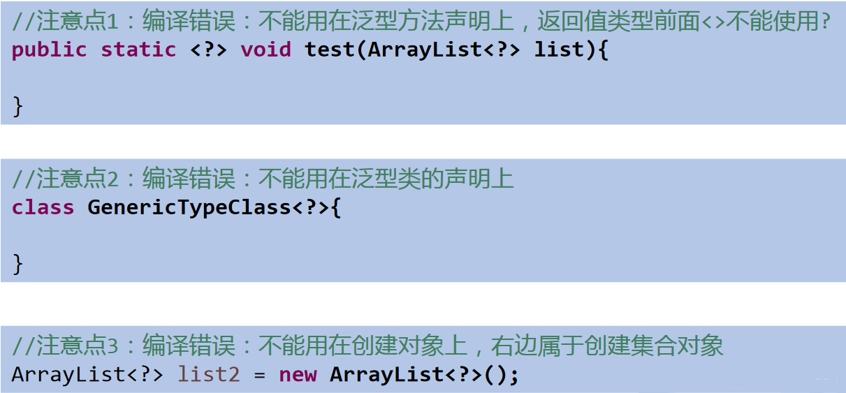 public void test(){ Object obj = new Object(); String str = new String(); obj = str; Object[] objects = null; String[] strings = null; objects = strings; //编译不通过 //Date date = new Date(); //str = date; //不兼容的类型。实际为 java.util.Date',需要 'java.lang.String' List<Object> list1 = null; List<String> list2 = null; //此时的list1和list2的类型不具有字符类关系 //编译不通过 //list1 = list2; /* 反证法: 假设list1 = list2; list1.add(123);导致混入非String的数据。出错 */ show(list1); show1(list2); } public void show1(List<String> list){ } public void show(List<Object> list){ }