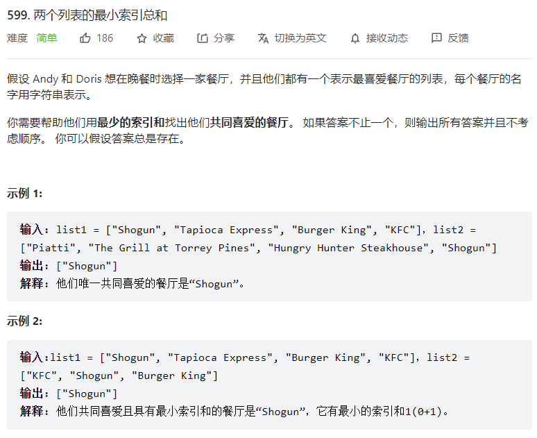 1 class Solution { 2 public String[] findRestaurant(String[] list1, String[] list2) { 3 Map<String,Integer> s1Map = new HashMap<String,Integer>(); 4 int len = list1.length; 5 for(int i = 0; i < len; i++){ 6 s1Map.put(list1[i],i); 7 } 8 List<String> ret = new ArrayList<>(); 9 int minIdx = -1; 10 for(int i = 0; i < list2.length; i++){ 11 String str = list2[i]; 12 if(minIdx != -1 && i > minIdx){ 13 break; 14 } 15 if(s1Map.containsKey(str)){ 16 int idx = s1Map.get(str) + i; 17 if(minIdx == -1){ 18 ret.add(str); 19 minIdx = idx; 20 }else if(idx < minIdx){ 21 ret.clear(); 22 ret.add(str); 23 minIdx = idx; 24 }else if(idx == minIdx){ 25 ret.add(str); 26 } 27 //minIdx = idx; 28 } 29 } 30 return ret.toArray(new String[ret.size()]); 31 } 32 }