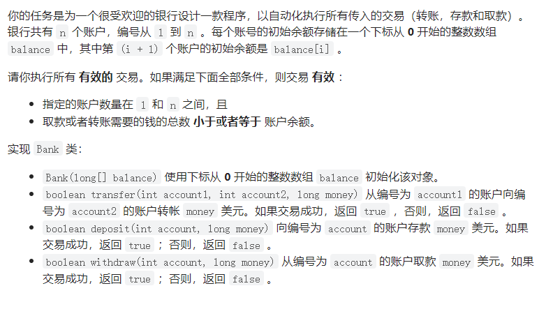 1 class Bank { 2 3 private long[] balance; 4 public Bank(long[] balance) { 5 this.balance = balance; 6 } 7 8 public boolean transfer(int account1, int account2, long money) { 9 if(account1 < 1 || account1 > balance.length){ 10 return false; 11 } 12 if(account2 < 1 || account2 > balance.length){ 13 return false; 14 } 15 if(balance[account1-1] >= money){ 16 balance[account1-1] -= money; 17 balance[account2-1] += money; 18 return true; 19 }else{ 20 return false; 21 } 22 } 23 24 public boolean deposit(int account, long money) { 25 if(account < 1 || account > balance.length){ 26 return false; 27 } 28 long preMoney = balance[account-1]; 29 balance[account-1] += money; 30 if(balance[account-1] == (preMoney + money)){ 31 return true; 32 }else{ 33 return false; 34 } 35 } 36 37 public boolean withdraw(int account, long money) { 38 if(account < 1 || account > balance.length){ 39 return false; 40 } 41 if(balance[account-1] >= money){ 42 balance[account-1] -= money; 43 return true; 44 }else{ 45 return false; 46 } 47 } 48 } 49 50 /** 51 * Your Bank object will be instantiated and called as such: 52 * Bank obj = new Bank(balance); 53 * boolean param_1 = obj.transfer(account1,account2,money); 54 * boolean param_2 = obj.deposit(account,money); 55 * boolean param_3 = obj.withdraw(account,money); 56 */