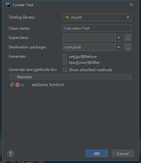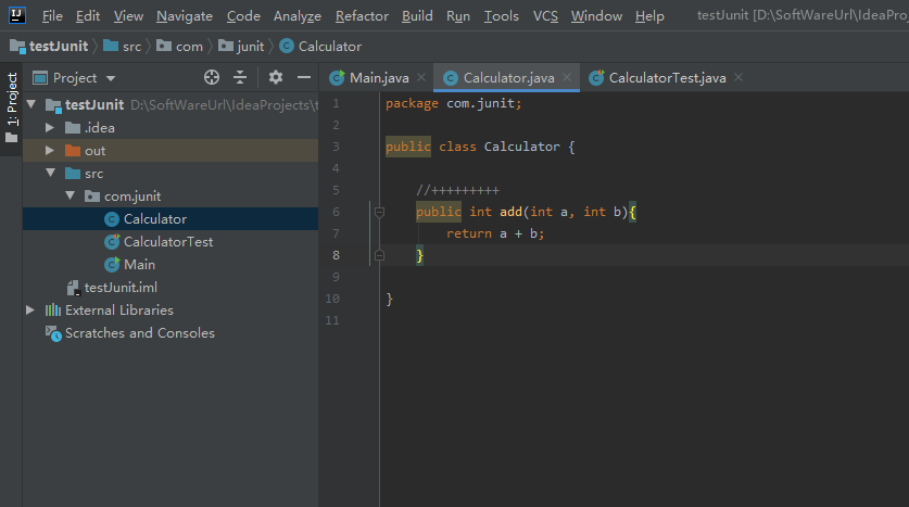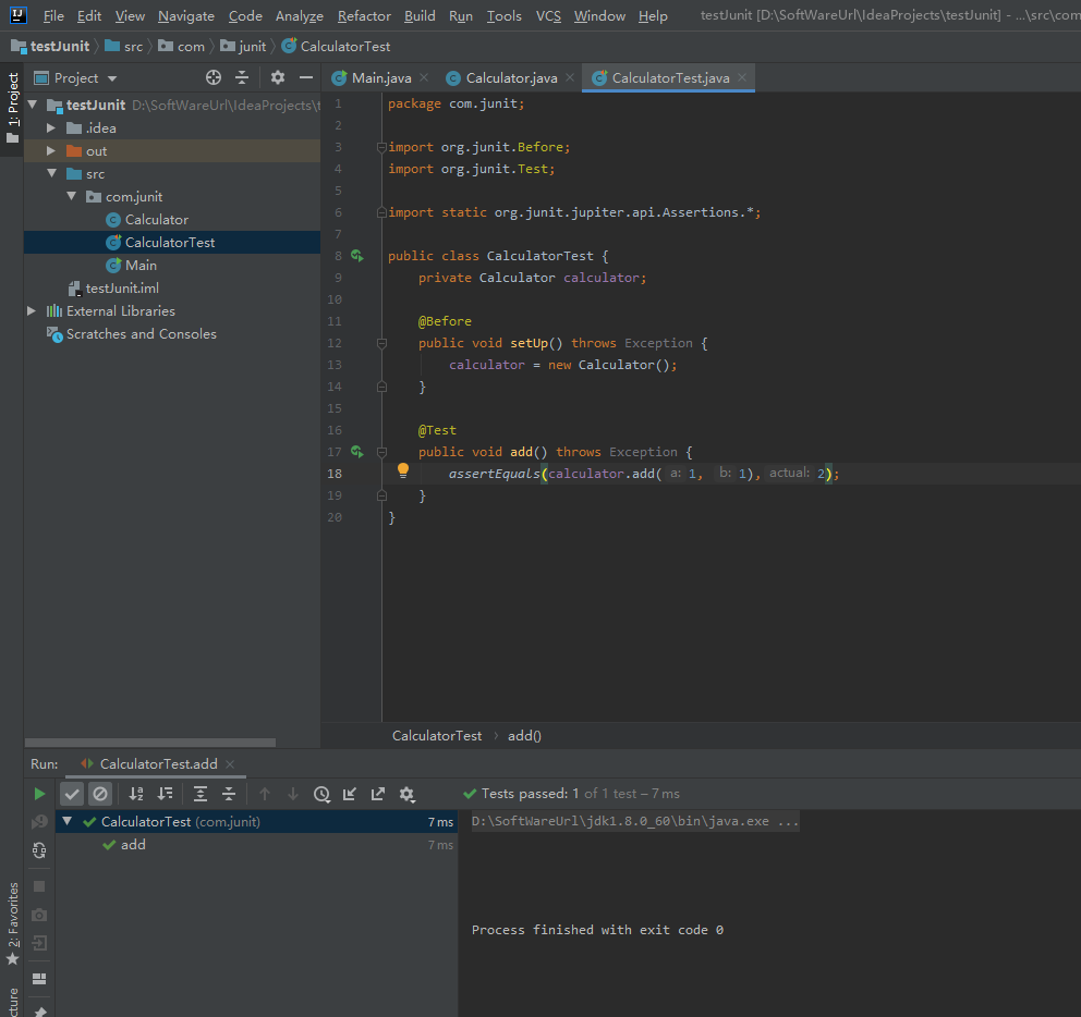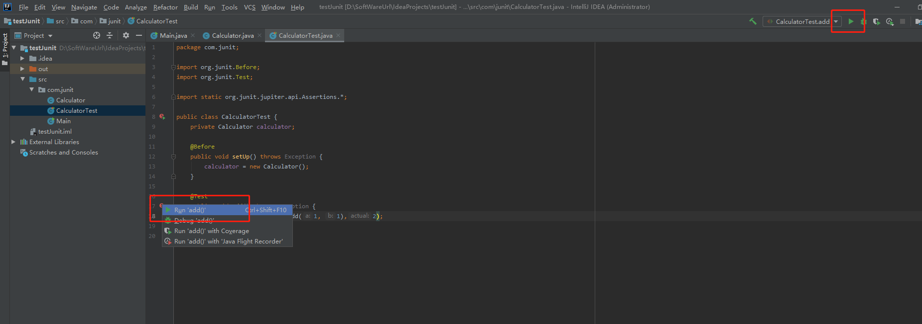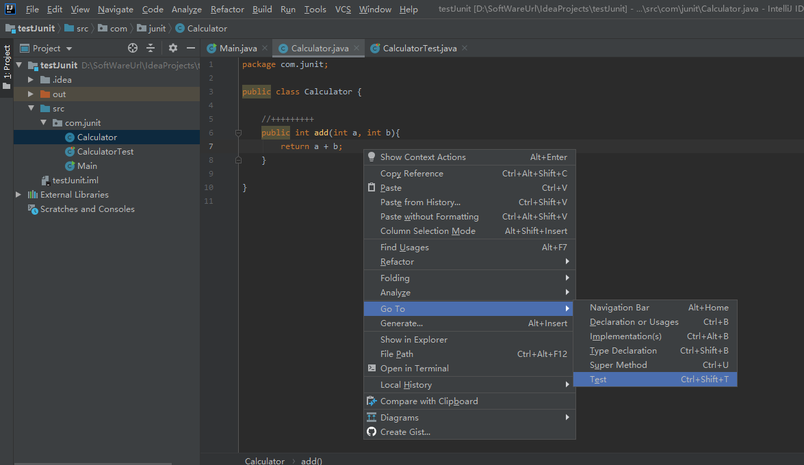 生成测试类后,添加测试方法CalculatorTest,代码如下: