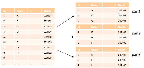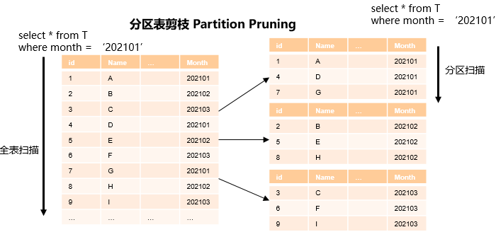 分区表对数据查找方面的帮助主要体现在对分区键进行谓词查询场景,例如一张以月份Month作为分区键的表,如图1所示。如果以普通表的方式设计表结构则需要访问表全量的数据(Full Table Scan),如果以日期为分区键重新设计该表,那么原有的全表扫描会被优化成为分区扫描。当表内的数据量很大同时具有很长的历史周期时,由于扫描数据缩减所带来的性能提升会有明显的效果,如图2所示。