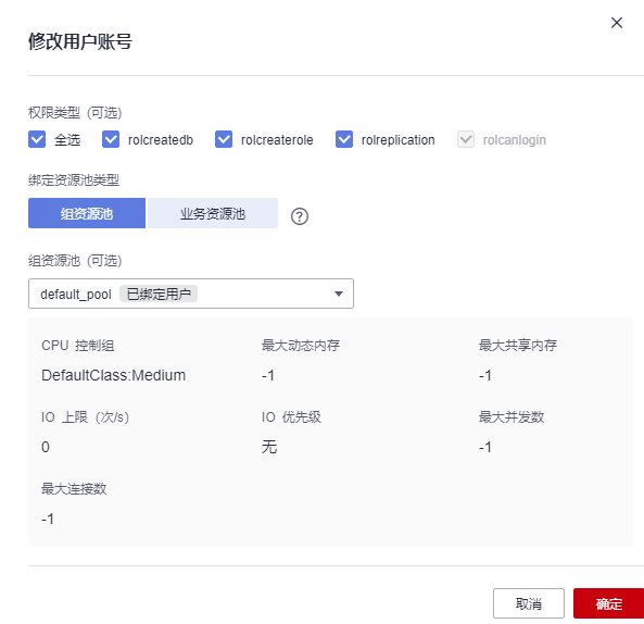 您可根据业务修改自己创建的用户账号的权限及绑定的资源池类型。