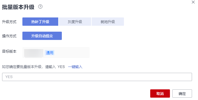 2. 在“批量版本升级”界面,选择“热补丁升级”,单击“升级回退 ”,选择“目标版本”,输入“YES”,单击“确定”。