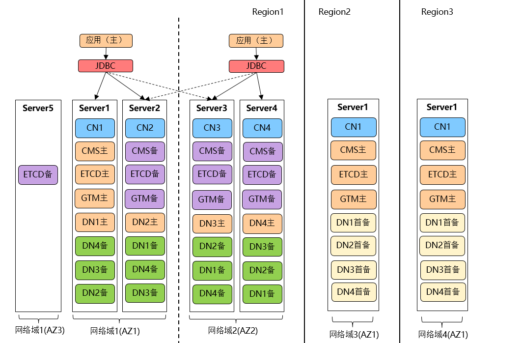 主实例集群与容灾集群的部署形态不同,主实例集群5节点4副本部署方案,4个数据节点及一个仲裁节点,两个容灾集群部署形态保持一致,均为单节点单副本形态部署。