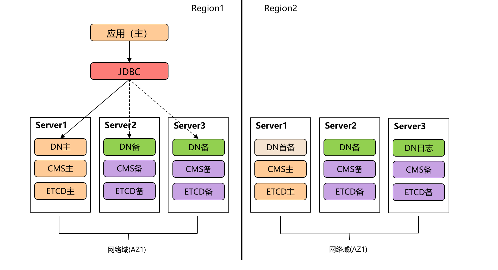 同城一个数据中心和异地一个数据中心的容灾部署形态,同城采用1主2备部署,异地采用1主1备1日志部署,提供了同城抵御组件级和节点级故障的能力,跨城的Region级容灾的能力。