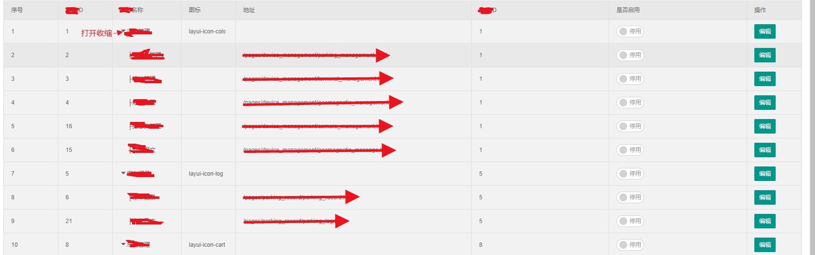 //表格布局 <table class="layui-table layui-form" id="data_list" lay-filter="data_list"> <thead> <tr> <th width="20" lay-data="{sort: true}">序号</th> <th width="110">测试名称</th> <th width="50">icon</th> <th width="450">地址</th> <th width="250">对应上级</th> <th width="250">是否启用</th> <th width="50">操作</th> </thead>