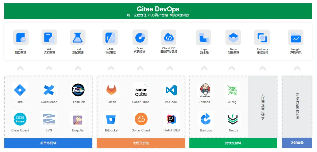 Gitee DevOps 精心打造了一套贴合国内软件研发团队实际需求的一站式解决方案,覆盖从项目协同规划、代码安全管控到持续交付上线的全流程关键环节。该平台深度扎根国内技术生态,确保各个环节紧密适配国产化要求。截至目前,Gitee DevOps 已成功推出 10 余款拥有自主知识产权的国产化产品,有效填补了国内企业在自主可控研发工具领域的空白,有力地替代了国外同类工具,为企业自主研发筑牢了坚实的技术根基。