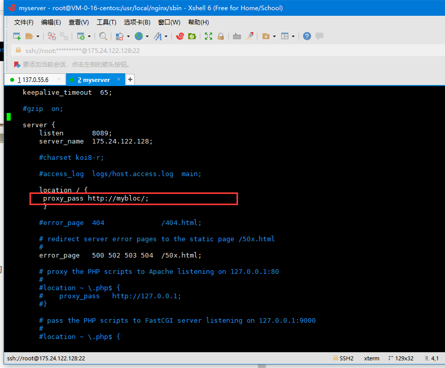 配置转发的目的upstream,访问175.24.122.128的8089端口时nginx会将请求分发到名为mybloc的upstream下的server