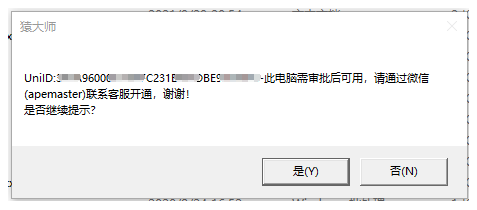 启动猿大师后会有如下弹窗,包含UID等信息,请截图发给猿大师客服开通试用授权。
