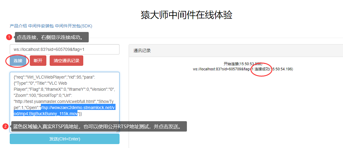 以全页面显示为例,首先点击连接,右侧会显示连接成功,如果没有成功,请确认本机83端口是否被占用,如果被占用。然后再把真实RTSP地址替换到下面蓝色区域,然后点击发送即可。