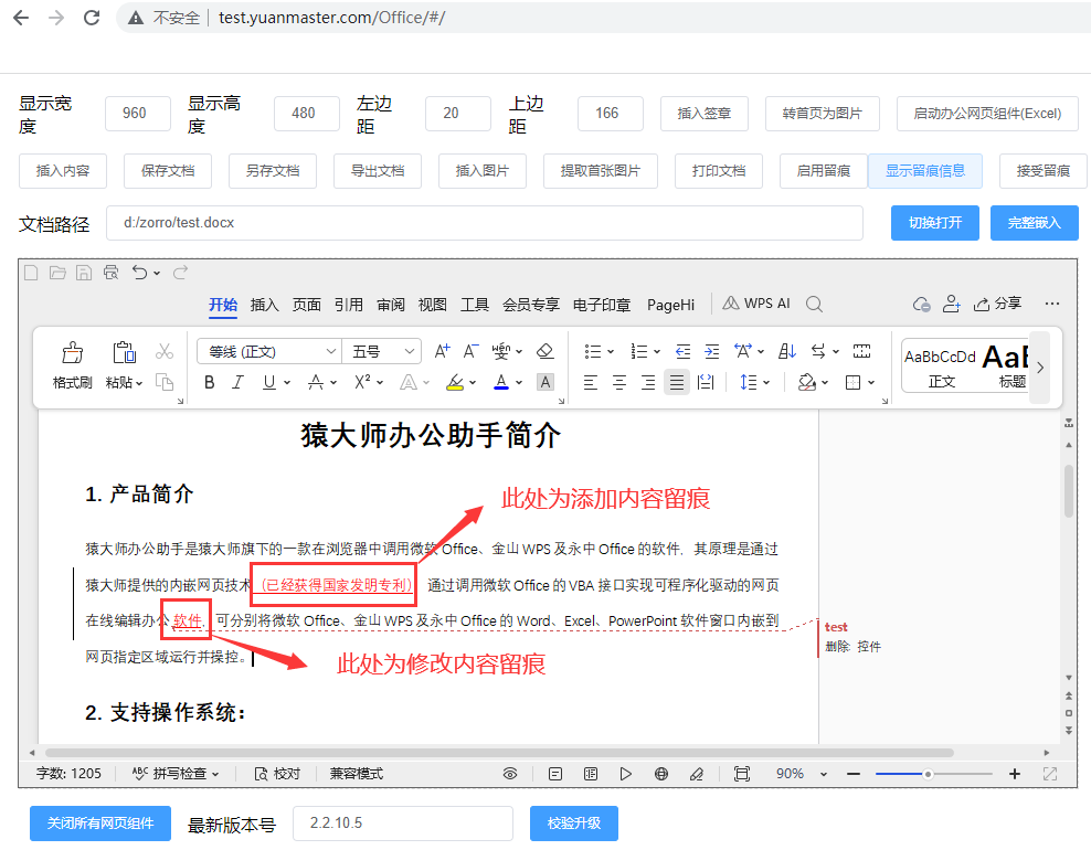 第二步:打开测试网页,网址:http://test.yuanmaster.com/Office/ 并且启用留痕,并且显示留痕信息。
