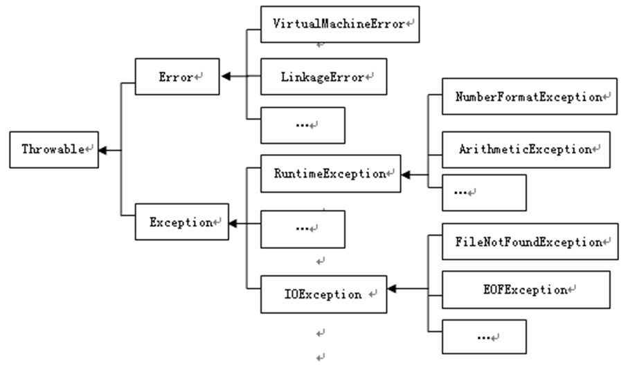 Java的异常类是处理异常时错误的特殊类,每一种异常对应一种特定的运行错误。所有的异常类都是系统类库中Exception类的子类,其继承结构如下:
