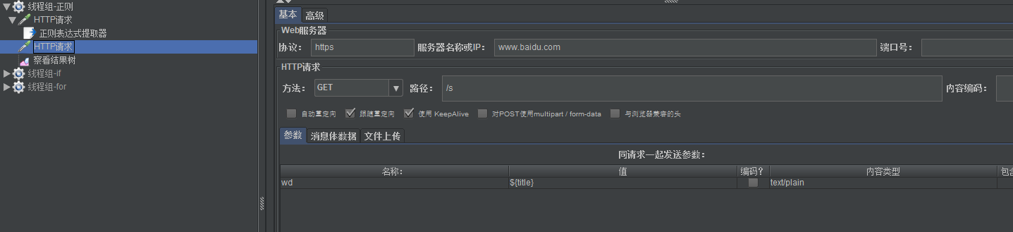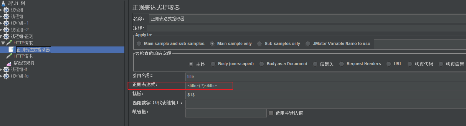 - 正则表达式:提取内容的正则表达式,相当于lr中的关联函数