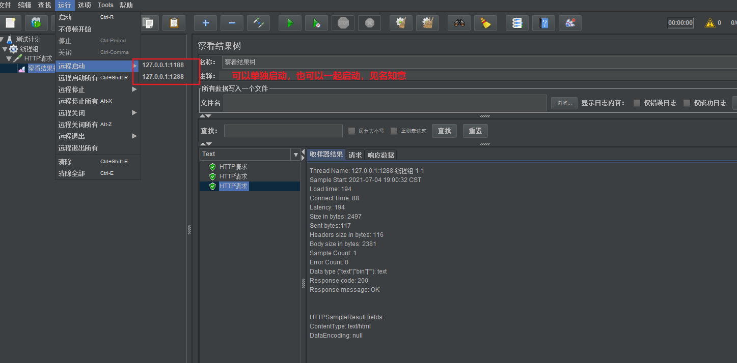 - 点击“运⾏”——“远程启动所有”控制代理机的运⾏