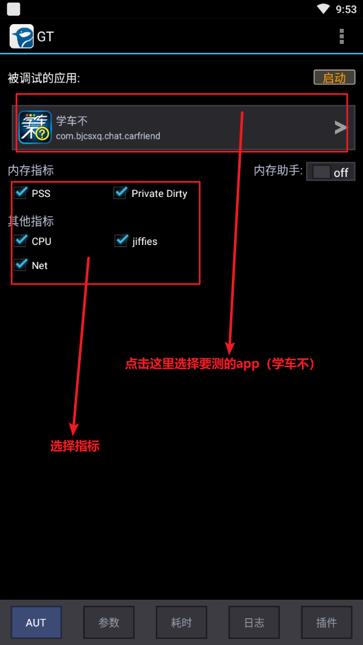 - 打开GT⼯具,在AUT界⾯选择被测试的app以及对应的性能指标