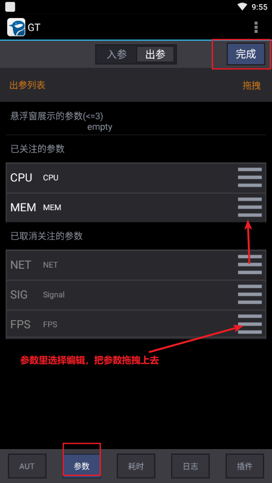 - 设置参数,进⼊到参数⻚⾯,点击右上⻆的"编辑"按钮,拖动想要测试的参数到已关注区域,⽽且要勾选。