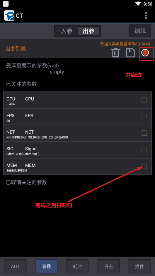- 打开GT进⼊到AUT界⾯,选择被测试的app,勾选NET指标