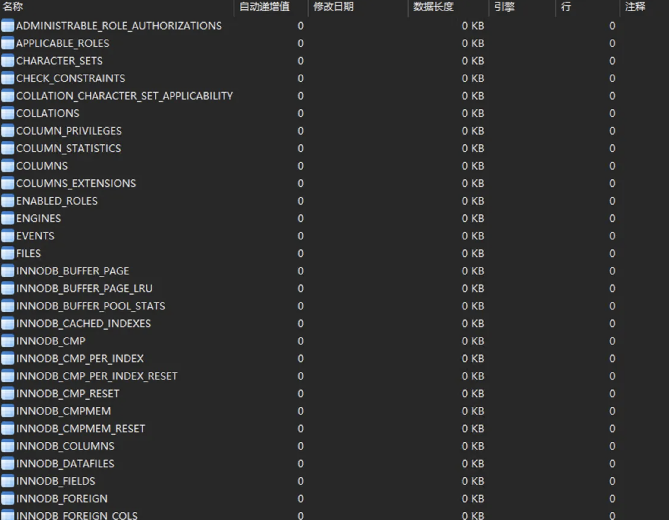 注意: 这个库里的表都是内存表,不使用磁盘的持久化,里边的数据会在数据库启动时自动填充,并随着数据库服务的停止而丢弃