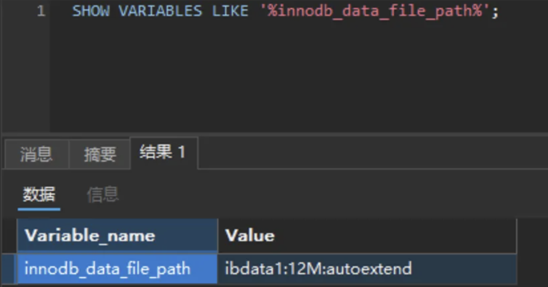 系统表空间可以有1个或者多个数据文件,默认情况下,在data目录中创建 一个名为ibdata1的系统表空间数据文件。系统表空间数据文件的大小和数 量由innodb_data_file_path启动选项定义