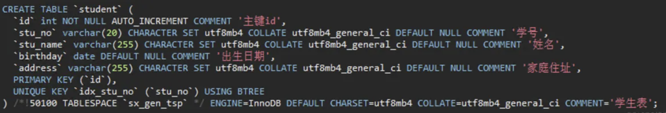 ) ENGINE = InnoDB CHARACTER SET = utf8mb4 COLLATE = utf8mb4_general_ci COMMENT = '学生表' TABLESPACE = `sx_gen_tsp`;
