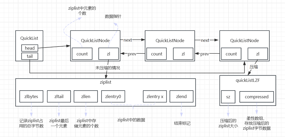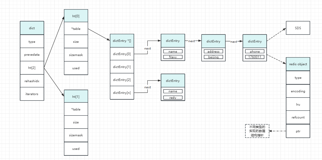 整体是一个dict的结构,在dict里边定义了一个长度为2的数组dictht,主要利用空间换时间的理念,在扩缩容的时候会用到,平时只会用到ht[0]。在ht[0].table里边是一个dictEntry数组,每个dictEntry是一个key-value的格式,其中key是redis定义的SDS格式,value是RedisObject对象格式,根据数据不同会采用不能的数据类型