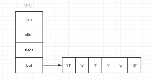 SDS的结构大概如上图所示,比如现在初始对应的是‘Hello’这个字符串。其中flags表示使用的是哪种SDS,比如等于1意思用sdshdr8(小于2^8的长度都用sdshdr8,len和alloc都只用两个字节),这个值会根据len去计算选择。另外在SDS中直接保存了字符串的长度,所以如果要获取一个字符串的长度是非常快的,不用像便利字数组那边遍历。后续会根据存放的内容动态进行扩容